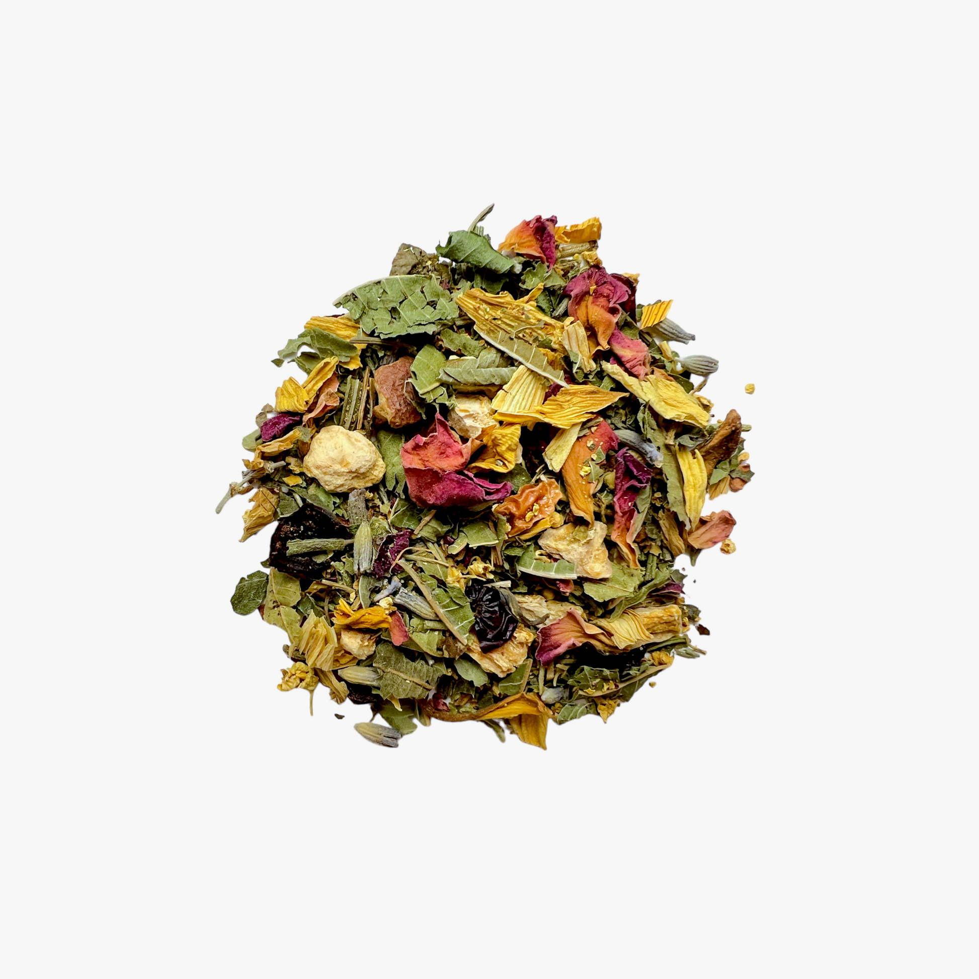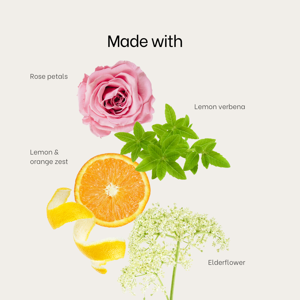 Lemon Verbena, Elderflower, Apple Pieces, Rosehip, Lemon Peel, Rosemary, Rose Petals, Orange Peel, Lavender, Sunflower Petals, Natural Flavouring.