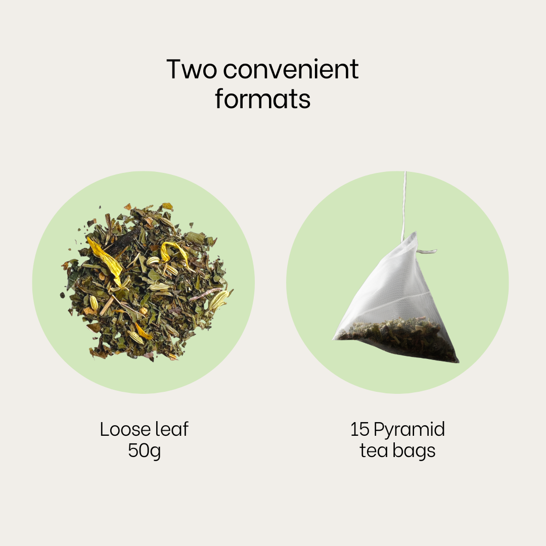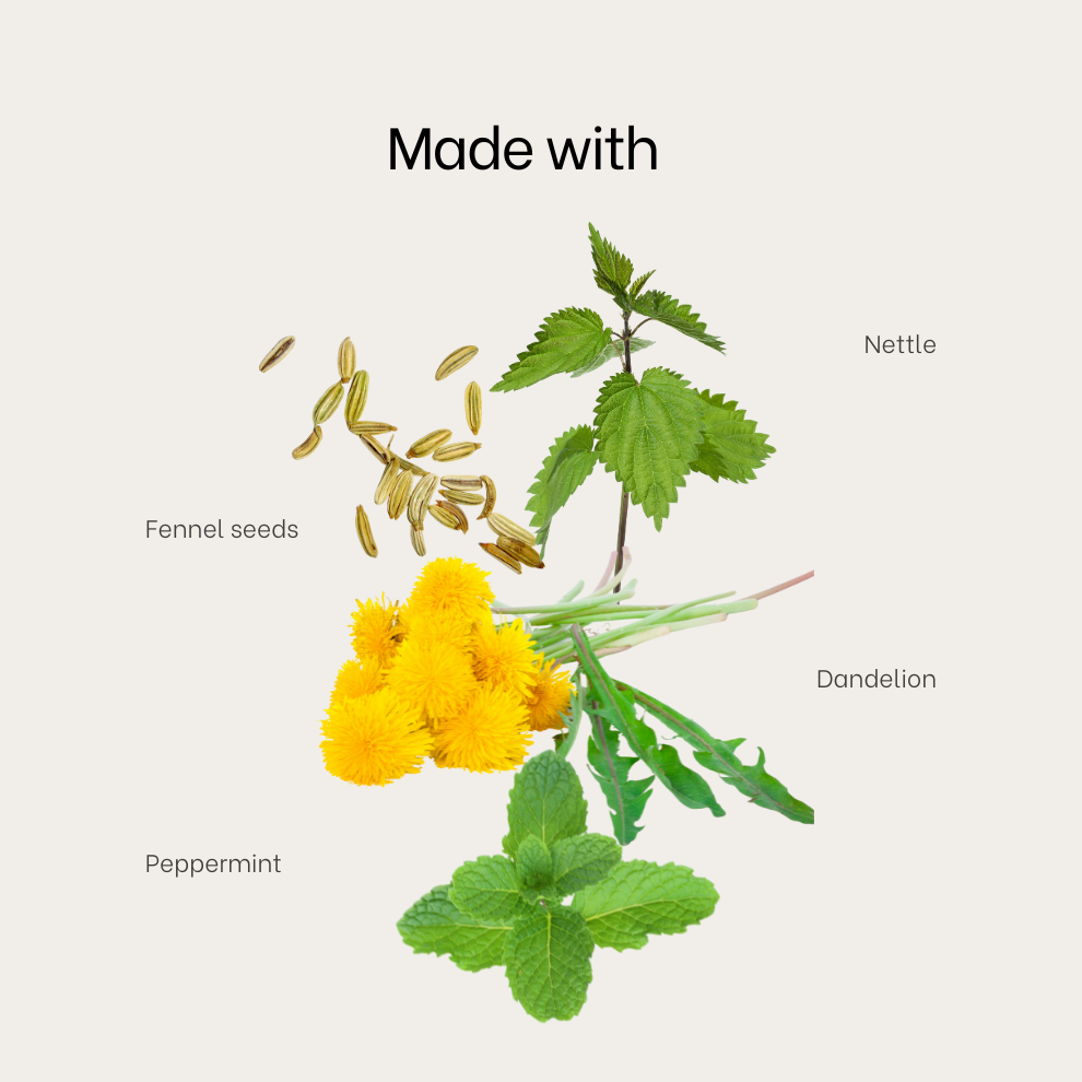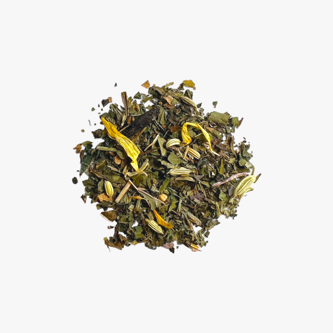 Nettle, Fennel, Peppermint, Dandelion Leaves, Hawthorn, Calendula Petals.